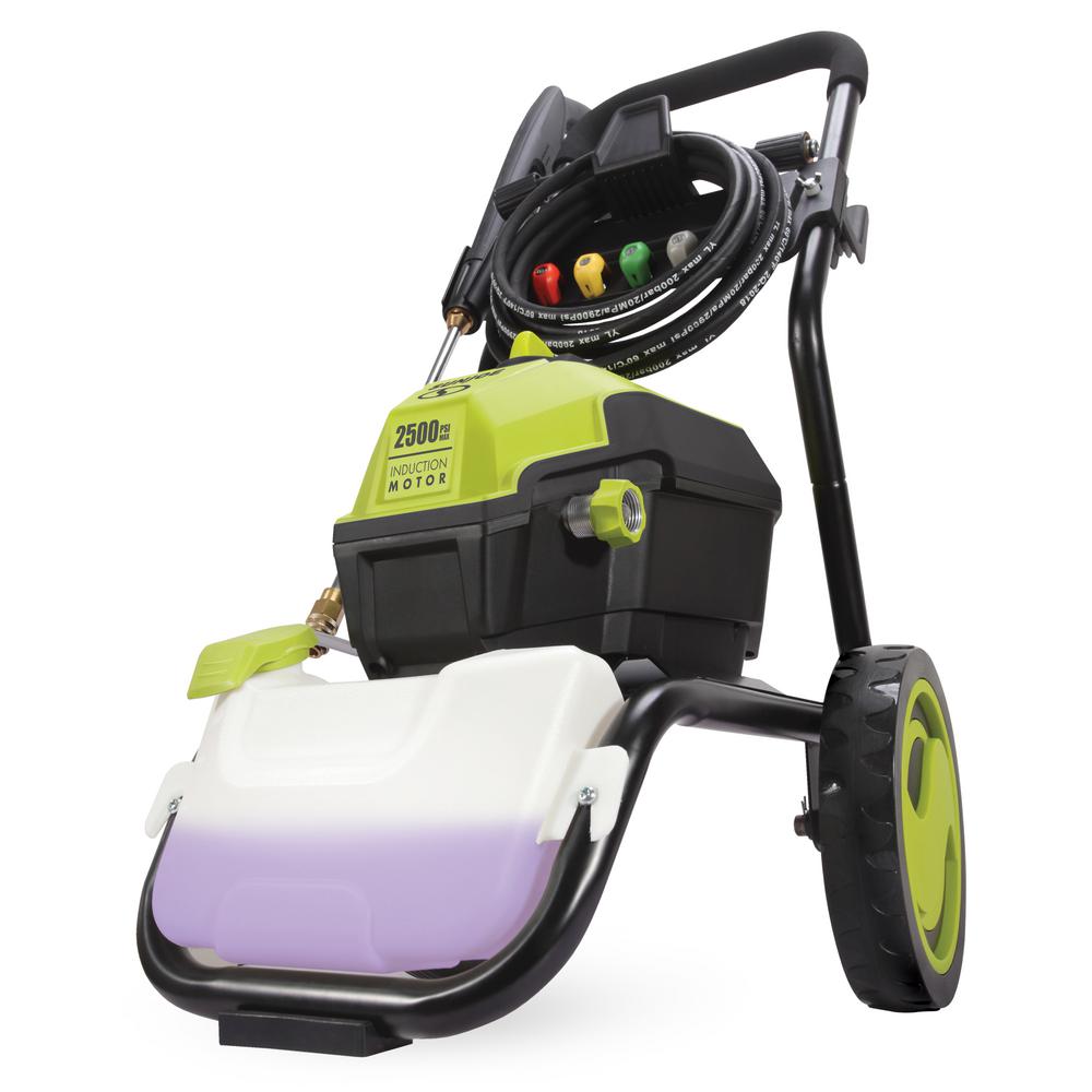 Fight back against dirt debris with SPX4500 13-Amp Electric Pressure from Sun Joe the latest eco-friendly, electric grime fighter. Tackle your toughest home, outdoor and auto cleaning tasks with the powerful 13 Amp induction motor, designed to last longer, run quieter, and work cooler than traditional universal motors. Blast up to 2500 psi of pressure and up to 1.48 GPM with SPX4500 to quickly wash away dirt and debris. Remove tar and grease from concrete, heavy mildew stains, oil stains, caked on mud, peeling paint, and other stubborn gunk and grime. Choose from the 5 onboard Quick Connect spray tips 0, 15, 25, 40 and soap to tackle light-, medium-, and heavy-duty cleaning tasks. Swap nozzles to quickly switch from punishing 0 pencil jet to 40 fan spray, or swap in the soap nozzle and dial-in your perfect mix from the 1 Gal. onboard detergent tank. Equipped with popular, pro-quality features like the 20 ft., steel-reinforced, high-pressure hose, the heavy-duty, metal roll cage, the onboard hose holder for neater storage, and 35 ft. power cord with GFCI protection SPX4500 is sure to perform for you. And every Sun Joe pressure washer comes backed by our complete 2-year warranty for the continuous, reliable performance that you’ve come to expect from Americas top-selling, eco-friendly brand of pressure washers. So, when there’s dirty work to be done, GO WITH JOE.