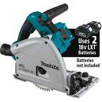 The Makita 18-Volt X2 (36-Volt) LXT Brushless 6-1/2 in. Plunge Circular Saw Kit (XPS01Z, tool only, batteries and charger sold separately) delivers precise and more accurate cutting when combined with an optional guide rail system (sold separately). The saw and rail system work together to produce accurate cuts with minimal tear-out. The saw combines a powerful Makita-built brushless motor powered by two 18-Volt LXT batteries with Automatic Speed Change Technology, which adjusts cutting speed and torque during the cut for optimum performance. The Saw has a variable speed control dial (2,500 RPM to 6,300 RPM), with soft start and an electric brake for added convenience. It has a large 2-3/16 in. cutting capacity at 90° with a bevel capability of minus 1 to 48 and positive stops at 22.5 and 45. When used with a rail system (sold separately) the Plunge Circular Saw is a more portable option to a table saw for select applications and is ideal for use on the job site or in a workshop. Its part of Makita’s expanding 18-Volt Lithium-Ion system, the worlds largest cordless tool system powered by 18-Volt Lithium-Ion slide-style batteries. Makita 18-Volt Lithium-Ion batteries have the fastest charge times in their categories, so they spend more time working and less time sitting on the charger.