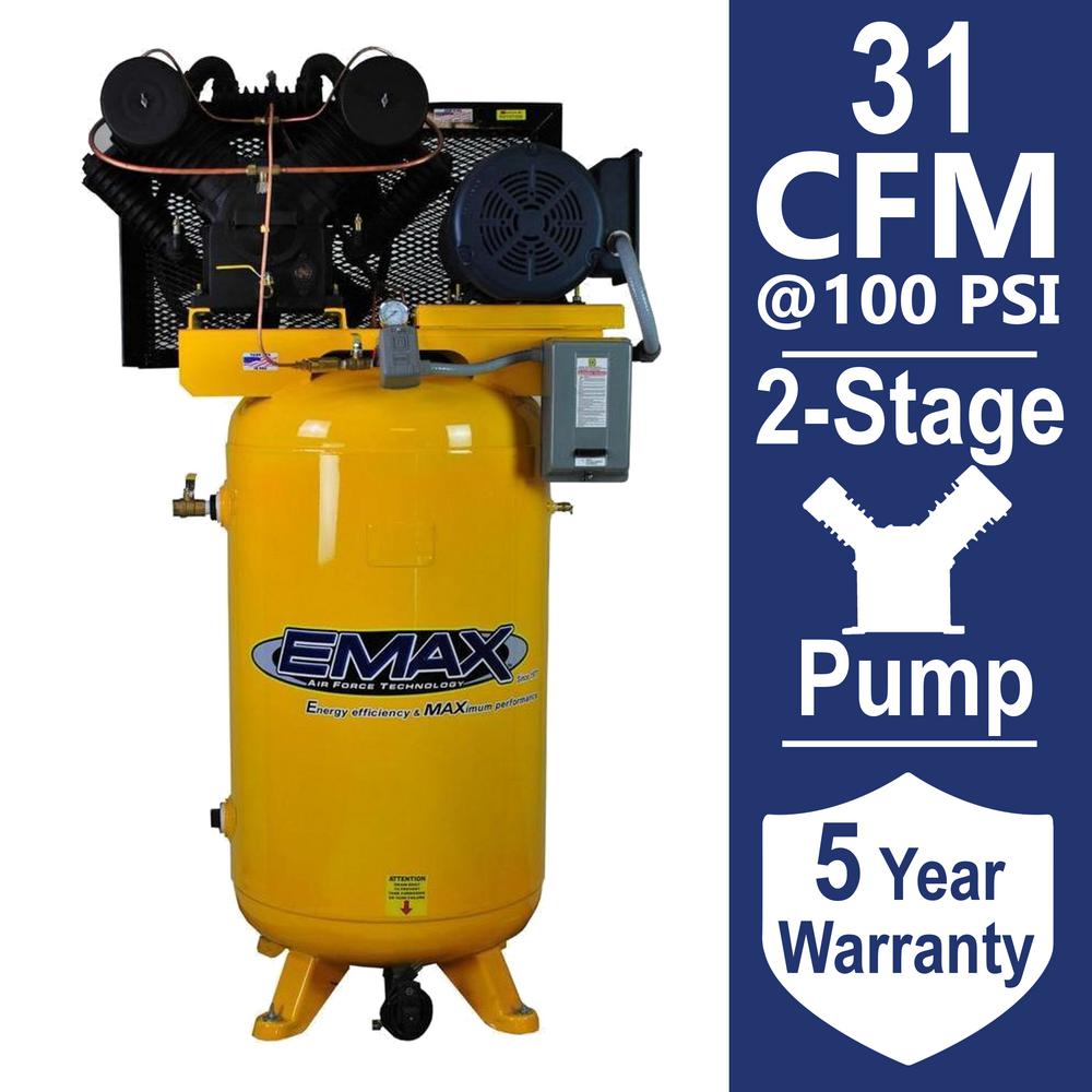 EMAX Compressor combines over 38 years of experience with the latest technology to deliver the best quality compressors. EMAX Compressor Tools and Equipment deliver overwhelming performance to ensure that they meet the needs of even the most demanding environments. All products are designed with exacting tolerance and specifications to deliver all the power that is needed at the Jobsite, Garage or Shop for extreme performance. EMAX 7.5 HP piston series offers quiet low RPMs with solid cast iron construction for extended life. Every EMAX Industrial PLUS Piston series compressor includes belt tensioned, auto drain and continuous run feature. Air stream technology insures you will have the coolest, quietest air compressor in the industry. Our 7.5 HP Piston Series are built to last and deliver super quiet operation. EMAX Compressors are made in America by Americans. Quality is EMAX USA number one priority. 5 year non-pro rated warranty on pump, motor and tank.