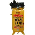 The Maxair Premium Industrial 5 HP Electric Single Stage 220-Volt, 80-Gal. ASME Vertical Tank has a High flow 3 piston cast iron “V” style pumps that generated 18.5 CFM at 100 PSI and max 170 PSI. This compressor is equipped with high efficiency reed valves for longer life, all metal belt guard for maximum cooling, liquid filled non vibrating pressure gauge for easy read, Auto Drop premium air filters.